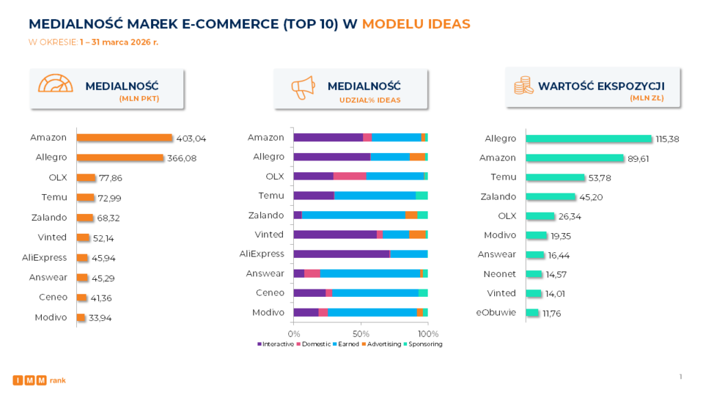Amazon, Allegro i OLX to trzy najbardziej medialne marki e-commerce w marcu 2026 r. Pozycja lidera zestawienia jest wynikiem połączenia publikacji biznesowych i aktywności w mediach społecznościowych, wzmacnianego informacjami o inwestycjach sięgających 23 mld zł w Polsce. Jednocześnie to Allegro zdominowało dyskusje internautów oraz przekaz reklamowy w RTV – z wydatkami na poziomie 44,8 mln zł i częstotliwością emisji spotów ponad trzykrotnie wyższą niż konkurencja. Medialność branży była budowana przede wszystkim przez treści publikowane przez użytkowników w social mediach, które odpowiadały za największą część widoczności marek.