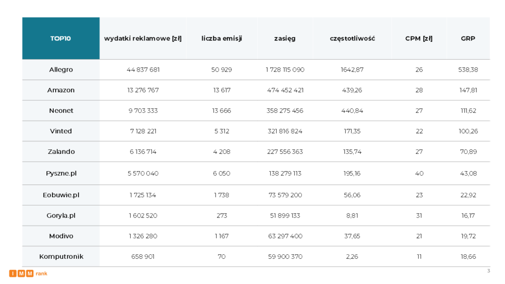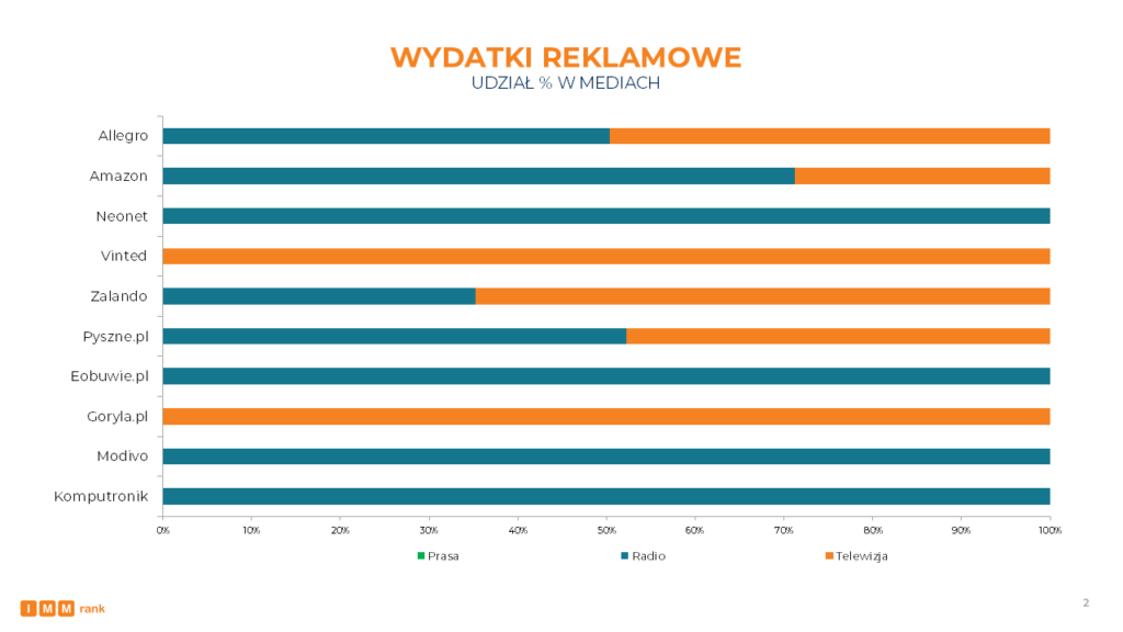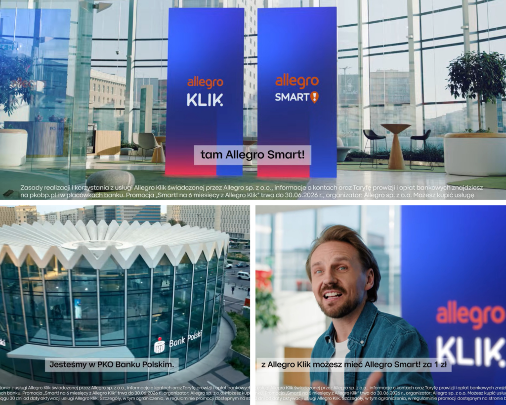 Największe nakłady reklamowe w radiu i telewizji w marcu 2026 roku poniosło Allegro. Kwota przekraczająca 44,8 mln zł przełożyła się również na największą liczbę emisji, najszerszy zasięg przekazu reklamowego oraz częstotliwość ukazywania się spotów ponad trzykrotnie wyższą, niż w przypadku kolejnych marek w zestawieniu. W rozgłośniach radiowych (regionalne, Radio RMF i ESKA) platforma reklamowała się głównie jako miejsce zakupu części samochodowych, choć pojawiały się także spoty okolicznościowe, związane z Wielkanocą i Dniem Kobiet. Prawie połowa spotów telewizyjnych to efekt współpracy z Bankiem PKO BP, który oferował płatność Allegro Klik dla nowych i obecnych klientów. W reklamach wystąpili Joanna Kulig i Paweł Domagała.