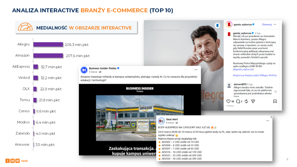Największą medialność w obszarze Interactive uzyskało Allegro. To właśnie ta marka zdominowała dyskusje w mediach społecznościowych i była najczęściej wymieniana przez internautów. W przypadku publikacji redakcyjnych (Earned) najwięcej publikacji skupiało się na tematyce biznesowej – wynikach giełdowych, pozycji na polskim rynku, krajobrazie branży e-commerce. Tego obszaru dotyczył również opublikowany w pierwszej połowie marca wywiad z Marcinem Kuśmierzem, prezesem Allegro. Poza tym dziennikarze pisali zarówno o rozwoju i nowościach (współpraca z Lux-Med i wprowadzenie usług medycznych, nowe standardy opakowań), jak i rosnącej konkurencji, w tym ze strony wchodzącej na polski rynek brytyjskiej platformy OneBuy.