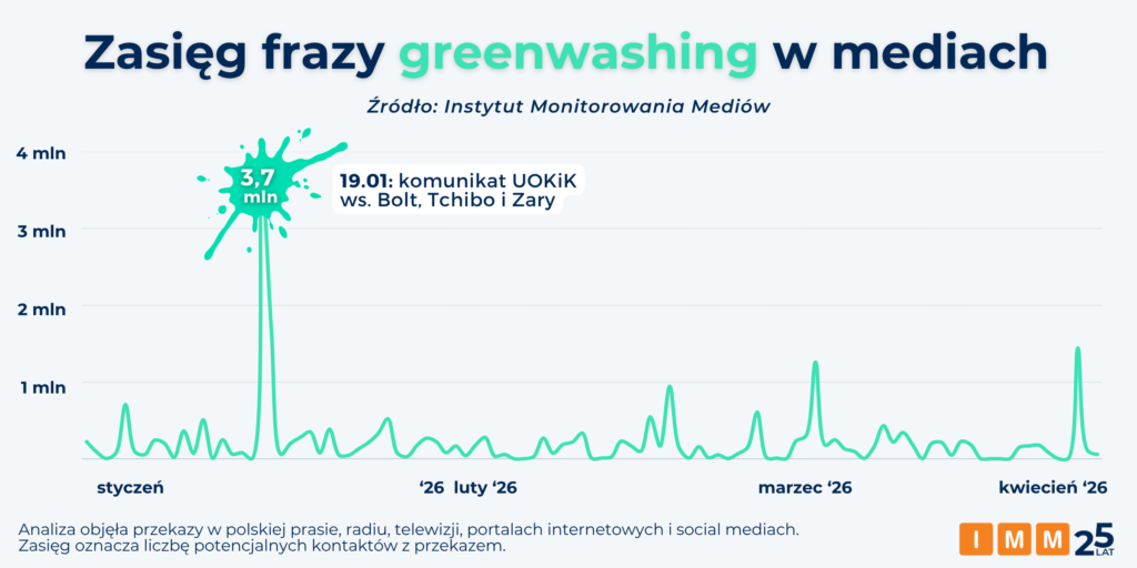 Analiza IMM zasięgu frazy „greenwashing” w pierwszych miesiącach 2026 roku wykazała, że największy pik jej popularności przypadł na 19 stycznia (3,7 mln potencjalnych kontaktów z przekazem) i był związany z głośnym postępowaniem UOKiK.