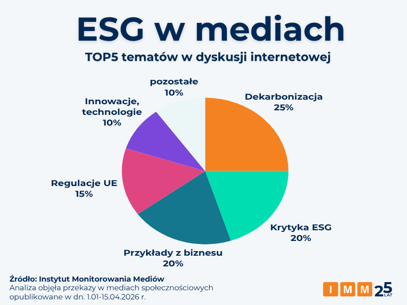 Pod postami o ESG opublikowanymi w okresie od początku stycznia do połowy kwietnia br. użytkownicy social mediów pozostawili 24,6 tys. interakcji (reakcji, komentarzy, udostępnień). Wśród komentarzy zawierających opinię przeważają głosy przychylne (szacunkowo 60%). Użytkownicy popierający ideę ESG opierają swoją argumentację na konkretnych przykładach wdrożeń. Pozytywna narracja jest szczególnie popularna na Instagramie i wśród użytkowników publikujących treści o zrównoważonym rozwoju. Posty i komentarze krytyczne wobec ESG często mają charakter emocjonalny. Na platformie X popularne jest sformułowanie „anti-ESG”. Eksperci IMM dostrzegli, że krytyka ESG generuje większy poziom zaangażowania użytkowników niż głosy popierające inicjatywę. Dominującą kategorią pozostają jednak przekazy neutralne – 89,6% wzmianek to treści informacyjne i relacyjne, co wskazuje na systematyczne zawężanie się grupy aktywnych uczestników tej debaty do środowisk specjalistycznych.