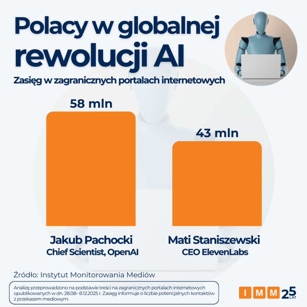 Instytut Monitorowania Mediów przeanalizował publikacje w portalach zagranicznych, które ukazały się w okresie od końca sierpnia 2025 roku – momentu opublikowania listy 100 najbardziej wpływowych ludzi w AI przez magazyn „TIME” – do 8 grudnia 2025 r. Wyniki badania wskazują, że polscy inżynierowie i przedsiębiorcy nie są już tylko cichymi bohaterami rewolucji technologicznej, ale stają się jej twarzami, mającymi znaczący udział w tworzeniu wizerunku Polski jako zagłębia wybitnych umysłów ścisłych.