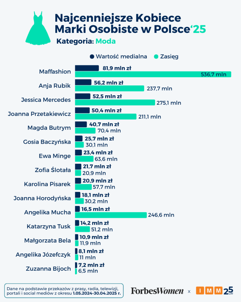 Wśród TOP 15 branży modowej znalazło się po pięć projektantek, modelek, a także influencerek modowych. To pokazuje, jak bardzo zmienił się obraz tej branży w ostatnich latach. Moda, która jeszcze niedawno kojarzyła się głównie z ekskluzywnymi wybiegami i wielkimi domami mody, dziś w dużej mierze przeniosła się do internetu. Dzięki mediom społecznościowym, aby zaistnieć w świecie mody, nie trzeba już być ani top modelką, ani projektantką luksusowych marek – wystarczy autentyczny styl, kreatywność i lojalna społeczność online. Dowodem na to jest fakt, że na podium rankingu znalazły się aż dwie influencerki: Maffashion oraz Jessica Mercedes