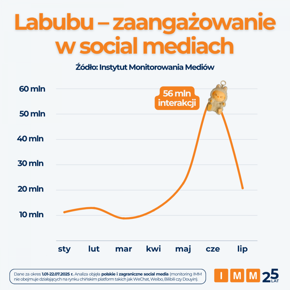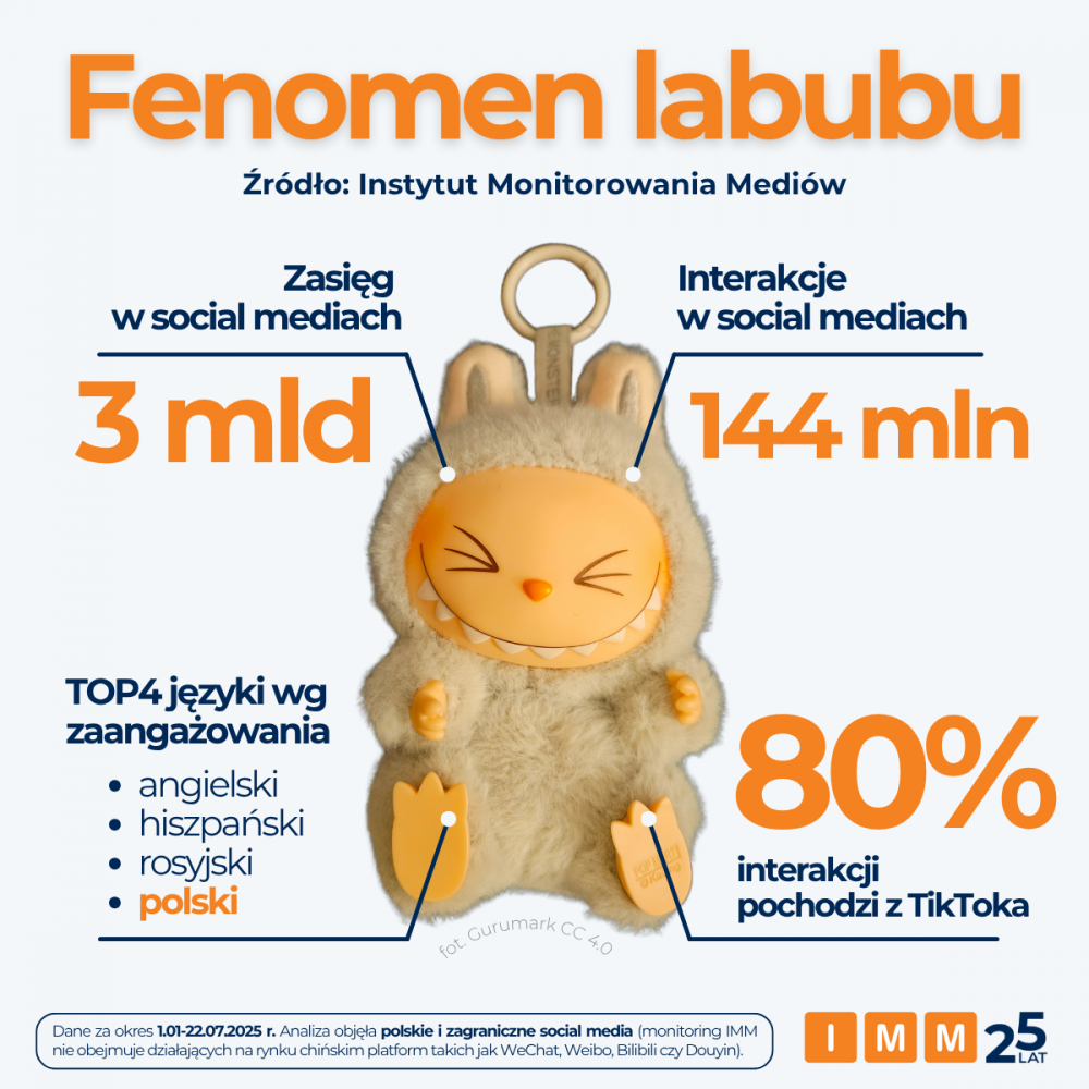 Maskotka z charakterystycznym uśmiechem i spiczastymi uszami stała się najchętniej kupowanym i świetnie rozpoznawanym kolekcjonerskim gadżetem 2025 roku. Eksperci Instytutu Monitorowania Mediów zbadali, czy rzeczywiście „świat oszalał na punkcie Labubu”. Analiza wykazała, że treści o maskotce wygenerowały ponad 3 mld kontaktów z przekazem i 144 mln interakcji w social mediach na całym świecie. Aż 80% reakcji, komentarzy i udostępnień pochodziło z TikToka, gdzie królują nagrania z Parku Labubu w Pekinie, unboxingi i projekty DIY. Słynna maskotka stała się także modowym dodatkiem promowanym przez topowe gwiazdy – od Rihanny po Marylę Rodowicz. Według informacji medialnych, w 2024 sprzedaż Labubu wyniosła globalnie 423 mln USD i zanotowała wzrost o 729% rok do roku.