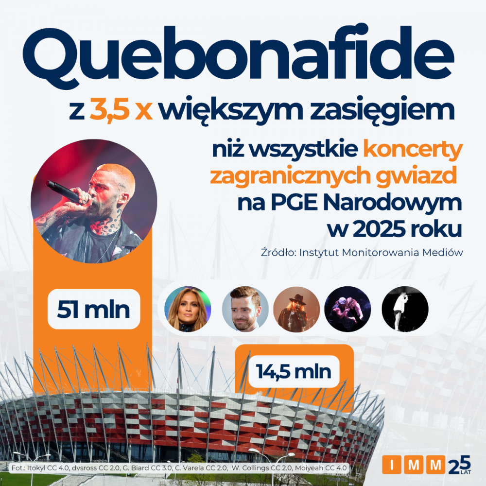 W 2025 roku PGE Narodowy gościł największe nazwiska światowej i polskiej sceny muzycznej. Koncerty Jennifer Lopez, Imagine Dragons, Guns N’ Roses, AC/DC, Justina Timberlake’a i Quebonafide przyciągnęły tysiące widzów na trybuny oraz – co równie istotne – miliony internautów w przestrzeni cyfrowej. Eksperci z Instytutu Monitorowania Mediów przeanalizowali medialny zasięg i zaangażowanie wokół każdego z tych wydarzeń. Bezapelacyjnym liderem zestawienia został polski artysta.