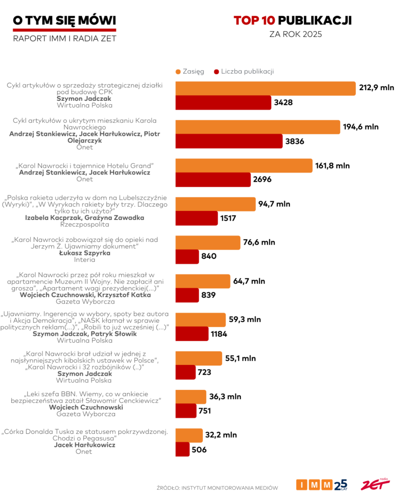 Zestawienie najbardziej zasięgowych publikacji w 2025 roku zdominowały artykuły przygotowane przez dziennikarzy Wirtualnej Polski i Onetu. W TOP 10 znalazły się również teksty z „Gazety Wyborczej”, Interii i „Rzeczpospolitej”. Wyniki rocznego raportu „O tym się mówi” zostały zaprezentowane podczas gali Nagrody Radia ZET im. Andrzeja Woyciechowskiego 2025. Specjalne wyróżnienie i nagrodę pieniężną ufundowaną przez Instytut Monitorowania Mediów odebrał zwycięzca rankingu Szymon Jadczak.