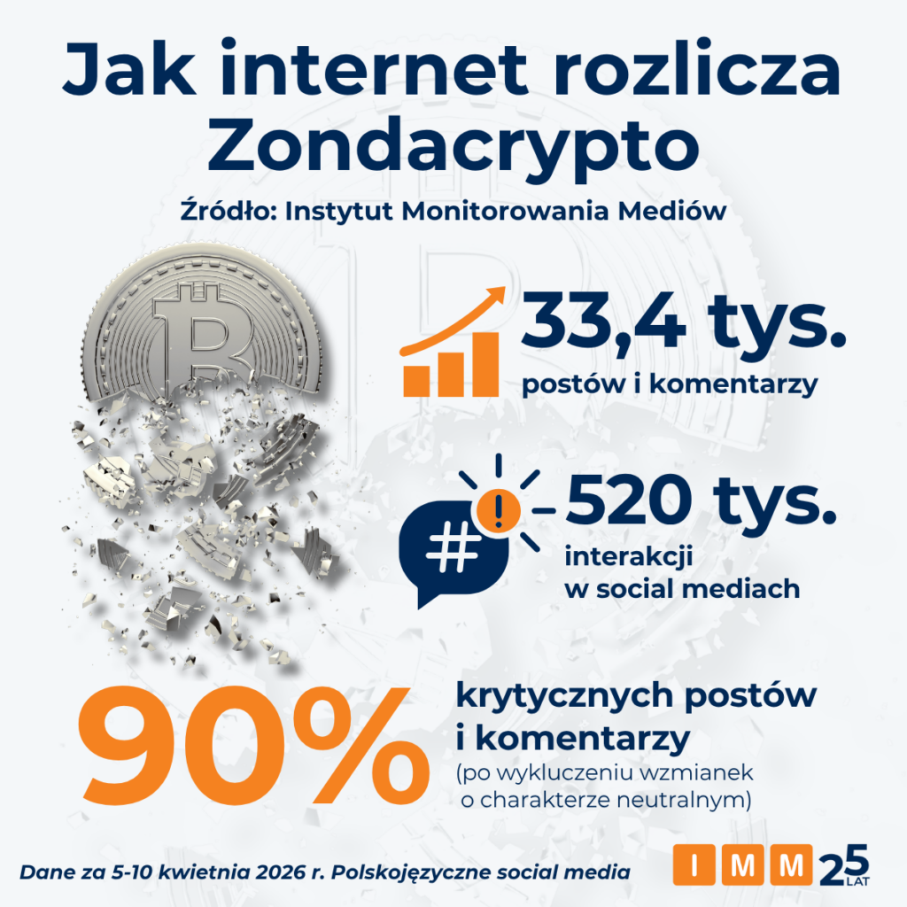 Afera wokół Zondacrypto została wyjątkowo jednoznacznie oceniona przez internautów. Z analizy Instytutu Monitorowania Mediów (IMM) wynika, że aż 90 proc. postów i komentarzy zawierających opinię na ten temat to głosy krytyczne. Kryzys giełdy kryptowalutowej jest przez internautów łączony wizerunkowo z politykami prawicy, a jego wpływ na reputację mogą także odczuć sponsorowane przez kontrowersyjną instytucję finansową kluby i organizacje sportowe.