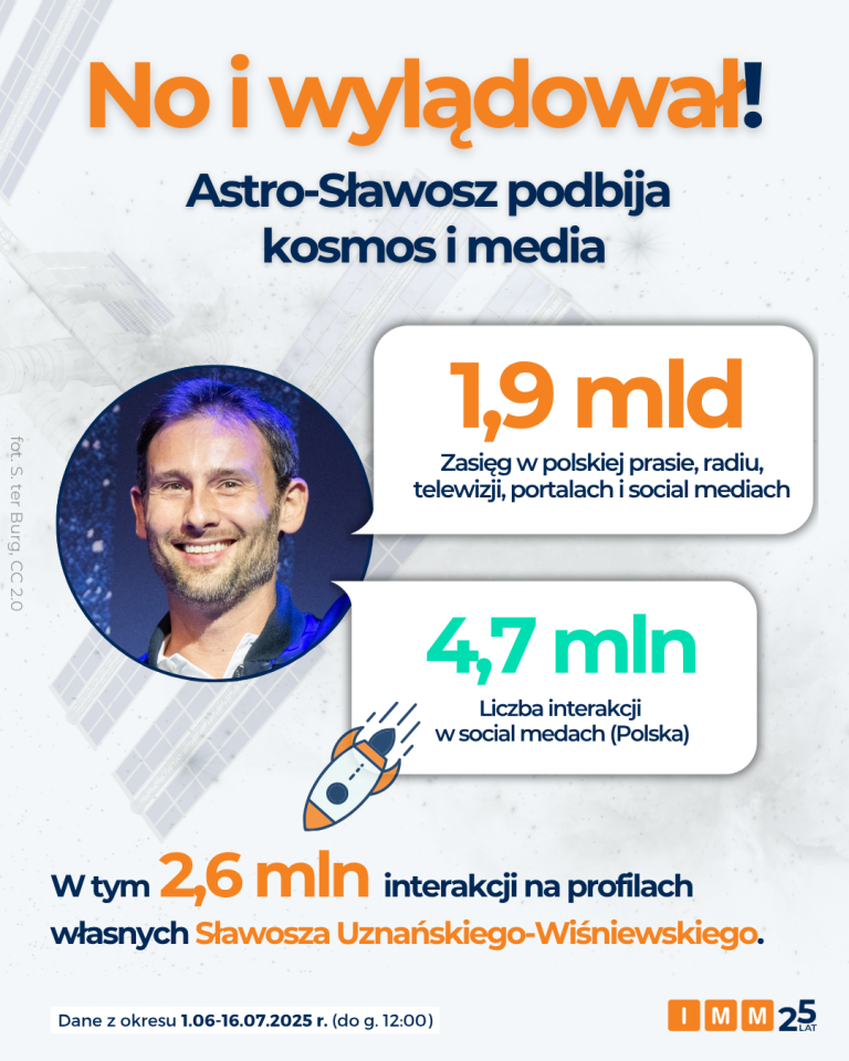 Sławosz Uznański-Wiśniewski jest drugim Polakiem w historii, który poleciał w kosmos – blisko 47 lat po słynnym locie Mirosława Hermaszewskiego z 1978 roku. Jego udział w misji Ax-4 wzbudził ogromne zainteresowanie w polskich mediach – eksperci z Instytutu Monitorowania Mediów (IMM) odnotowali blisko 2 mld potencjalnych kontaktów z przekazem, a zaangażowanie w mediach społecznościowych to blisko 5 milionów reakcji, komentarzy i udostępnień. Temat pojawiał się w mediach głównego nurtu oraz popularno-naukowych, dzięki czemu znacząco przyczynił się do popularyzacji nauki i wiedzy o kosmosie w Polsce.