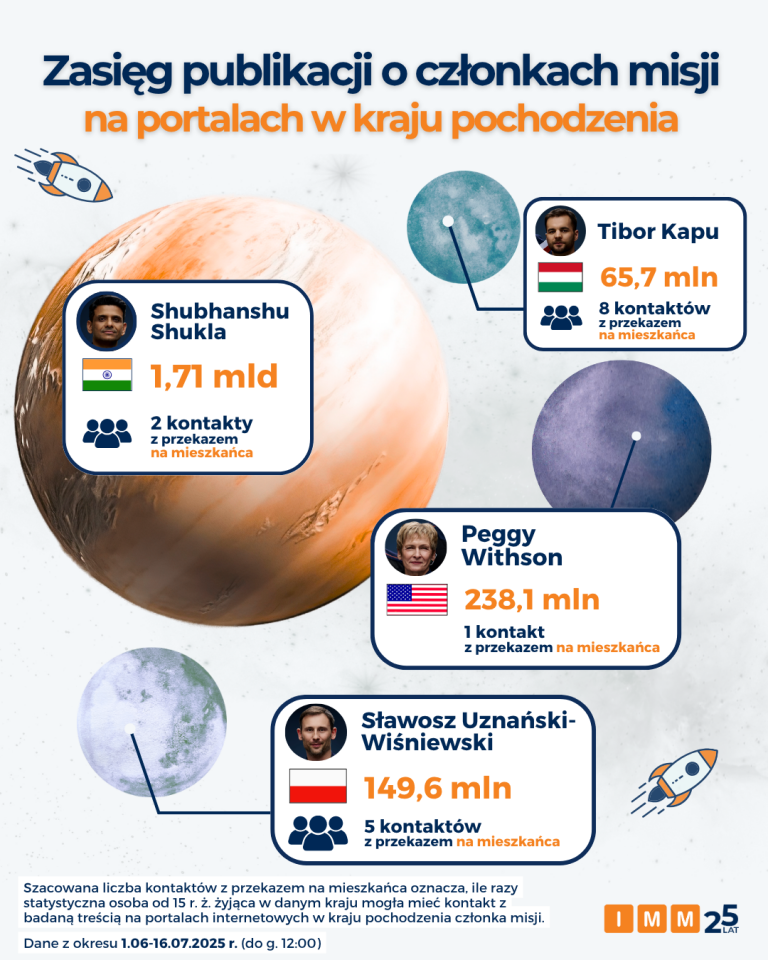 Temat udziału Sławosza Uznańskiego-Wiśniewskiego w misji Ax-4 osiągnął blisko 1,9 mld zasięg we wszystkich typach mediów. Oznacza to, że statystyczna osoba w Polsce od 15 r. ż. miała kontakt z tymi treściami średnio 59 razy