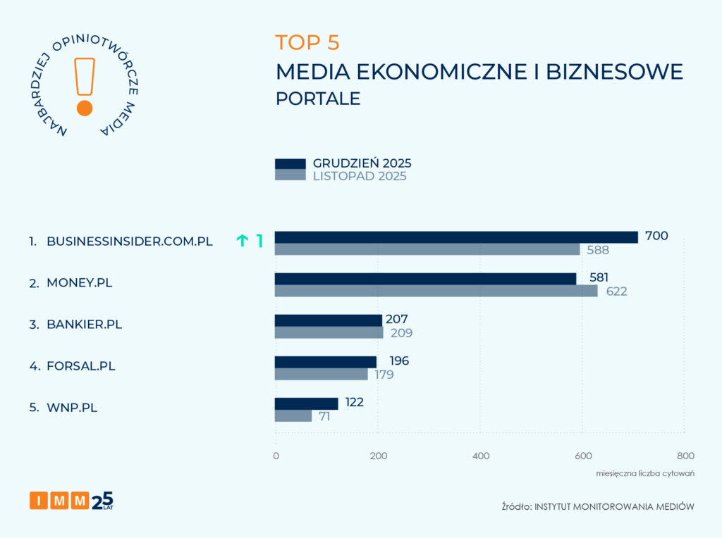 Zestawienie IMM najbardziej opiniotwórczych portali o tematyce ekonomiczno-biznesowej otwiera Business Insider (awans o 1 pozycję), który wygenerował 700 cytowań. Portal dotarł do informacji o piśmie ministry zdrowia skierowanym do ministra finansów. Dokument dotyczył planowanych cięć w budżecie NFZ.