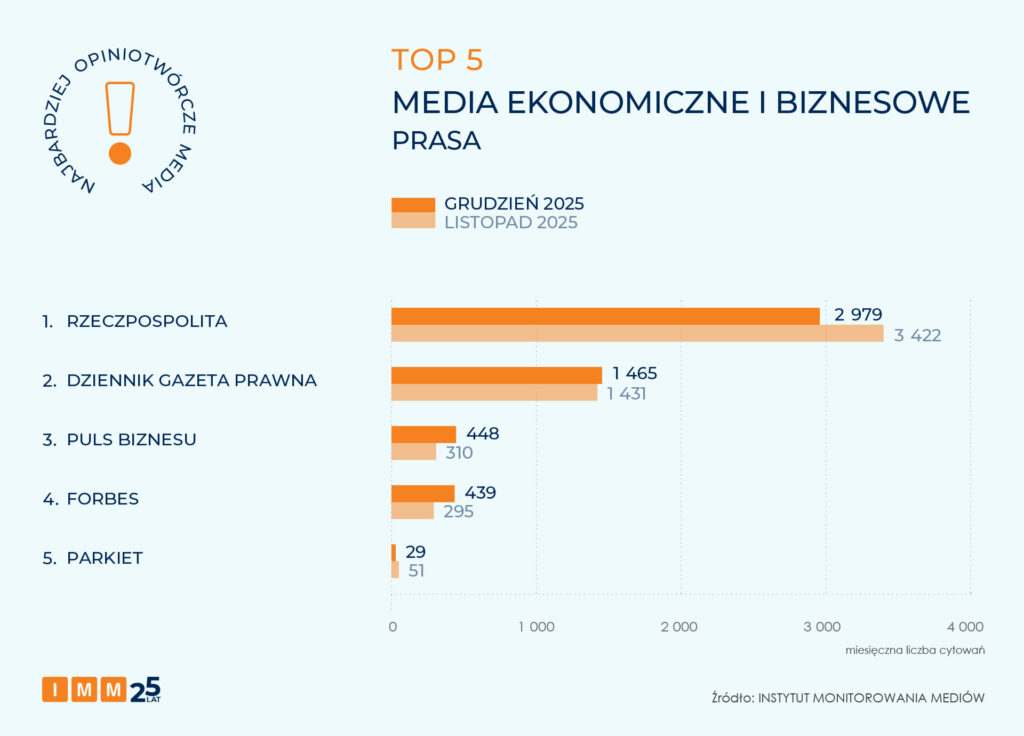Ranking najbardziej opiniotwórczych tytułów prasowych o tematyce biznesowej otwiera „Rzeczpospolita”, osiągając wynik blisko 3 tys. cytowań.