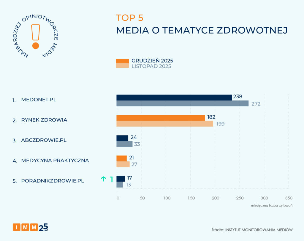 W rankingu najczęściej cytowanych mediów o tematyce medycznej pierwsze miejsce utrzymał Medonet, osiągając wynik 238 cytowań. Drugie miejsce zajął Rynek Zdrowia ze 182 powołaniami na źródło. Trzecie miejsce utrzymał portal ABC Zdrowie z wynikiem 24 cytowań.