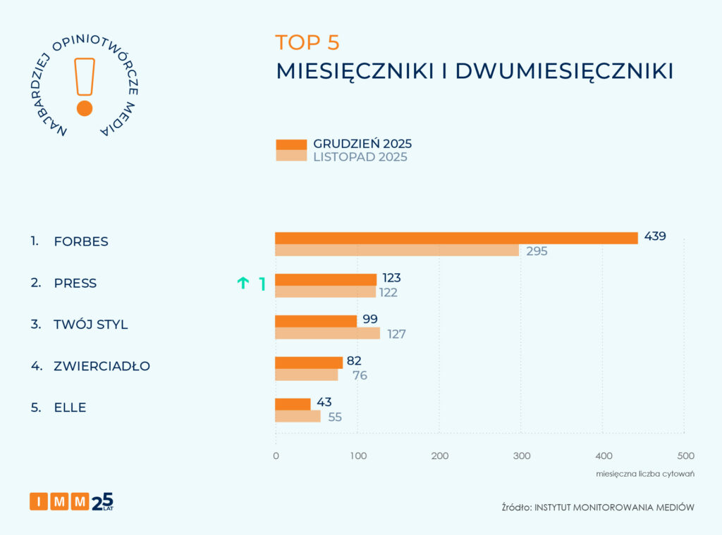Zestawienie IMM najczęściej cytowanych miesięczników i dwumiesięczników grudnia otwiera „Forbes”, który wygenerował 439 cytowań. Drugie miejsce należy do magazynu „Press” z wynikiem 123 cytowań i awansem o 1 pozycję. Na trzeciej pozycji znalazł się „Twój Styl”99 powołaniami na źródło.