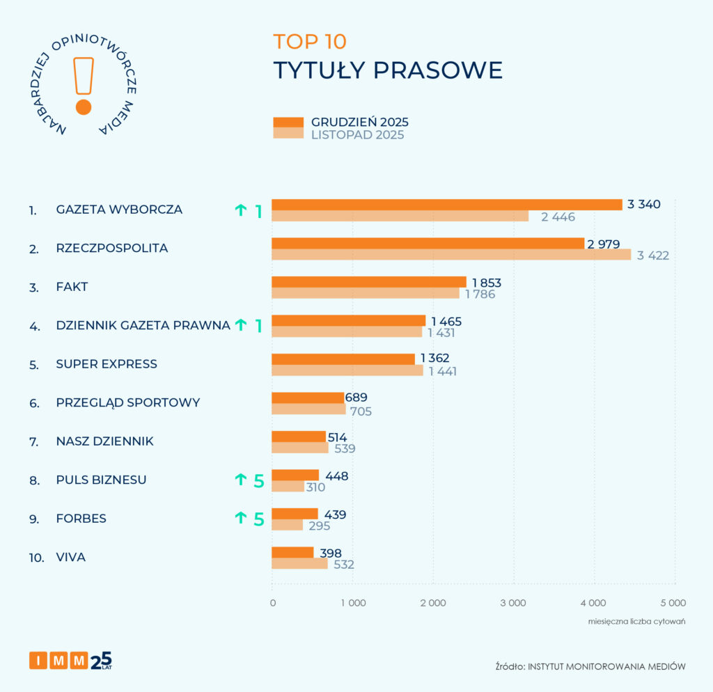Zestawienie najczęściej cytowanych tytułów prasowych w grudniu otwiera „Gazeta Wyborcza” z liczbą ponad 3,3 tys. odniesień w mediach i awansem o 1 pozycję.