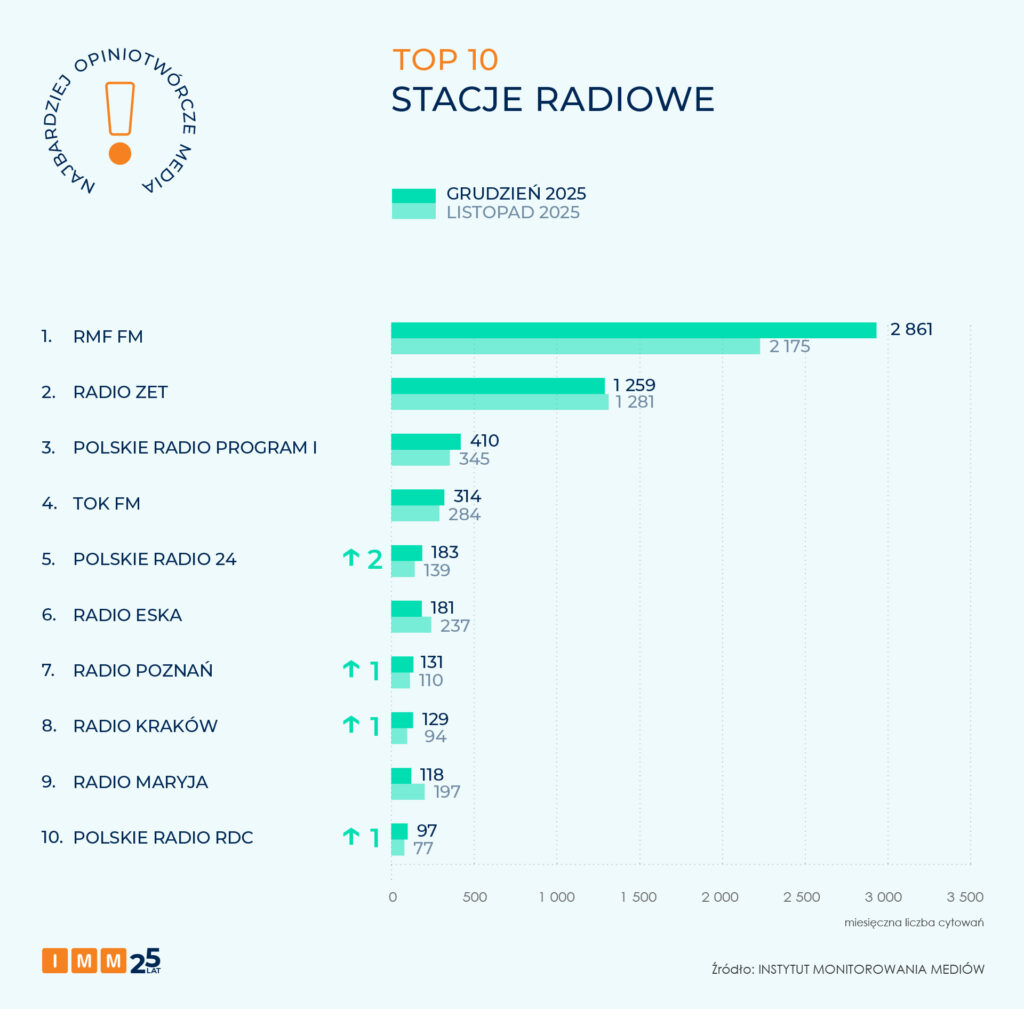 Pozycję lidera w rankingu najczęściej cytowanych stacji radiowych grudnia utrzymało RMF FM, osiągając wynik niemal 2,9 tys. odniesień w mediach. Gościem stacji był szef BBN Sławomir Cenckiewicz, który wypowiadał się m.in. na temat pomysłu przywrócenia obowiązkowej służby wojskowej