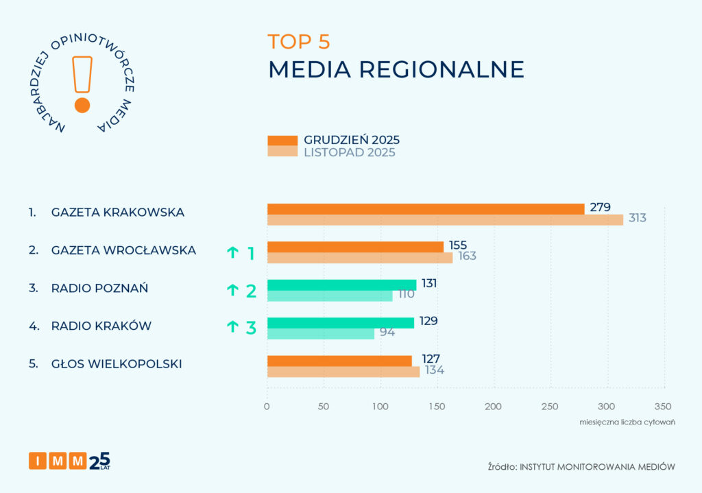 Drugie miejsce zajęła „Gazeta Wrocławska” z wynikiem 155 cytowań i awansem o 1 pozycję. Podium zamyka Radio Poznań z wynikiem 131 odniesień w mediach i awansem o 2 miejsca w zestawieniu.