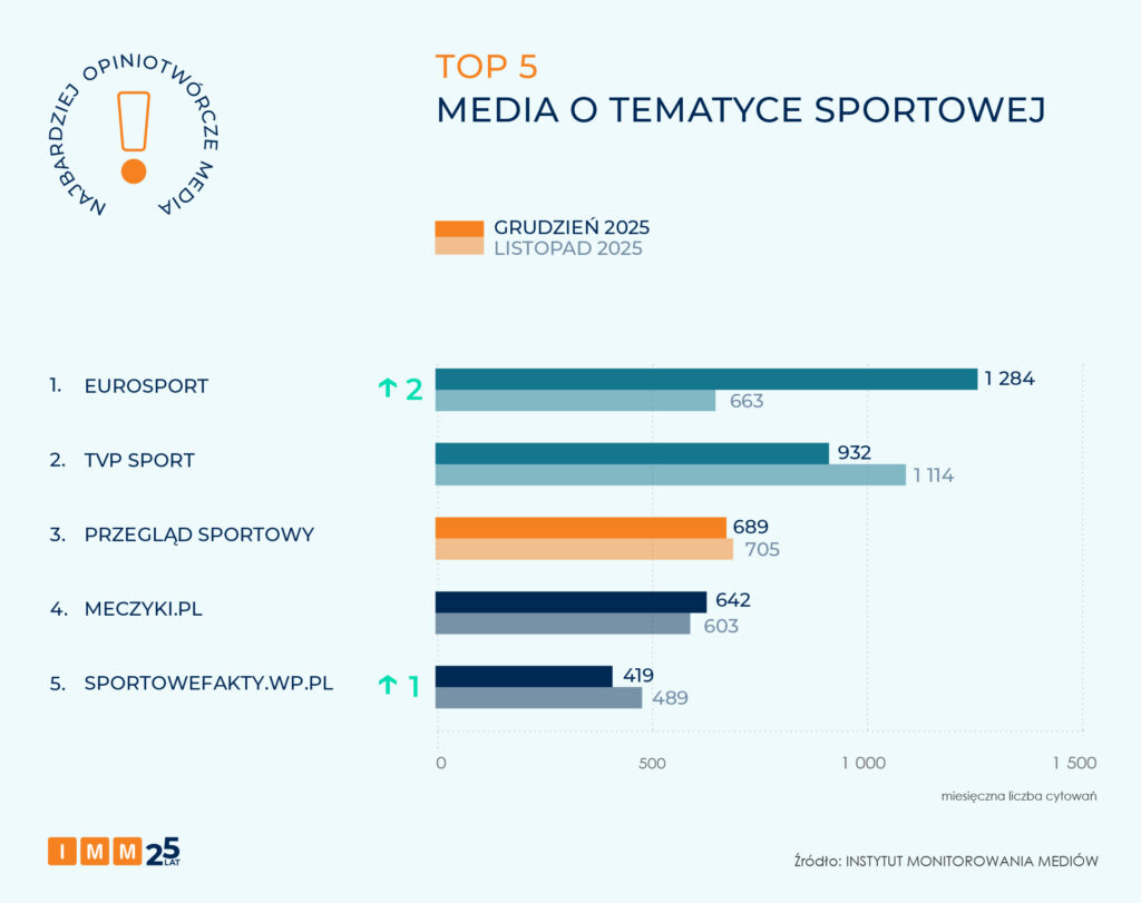 Najbardziej opiniotwórczym medium o tematyce sportowej w grudniu został Eurosport, który awansował o 2 miejsca i osiągnął wynik blisko 1,3 tys. odniesień w innych mediach.