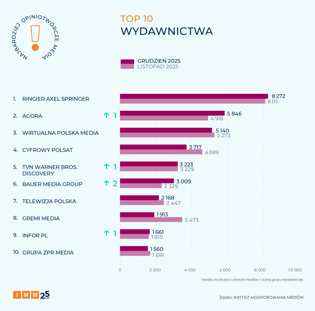 Pierwsze miejsce wśród najbardziej opiniotwórczych wydawnictw grudnia utrzymuje Ringier Axel Springer Polska, którego redakcje Business Insider, „Fakt”, „Forbes”, Medonet, „Newsweek”, Noizz, Onet, Plejada i „Przegląd Sportowy” były cytowane przez dziennikarzy innych mediów w Polsce blisko 8,3 tys. razy.