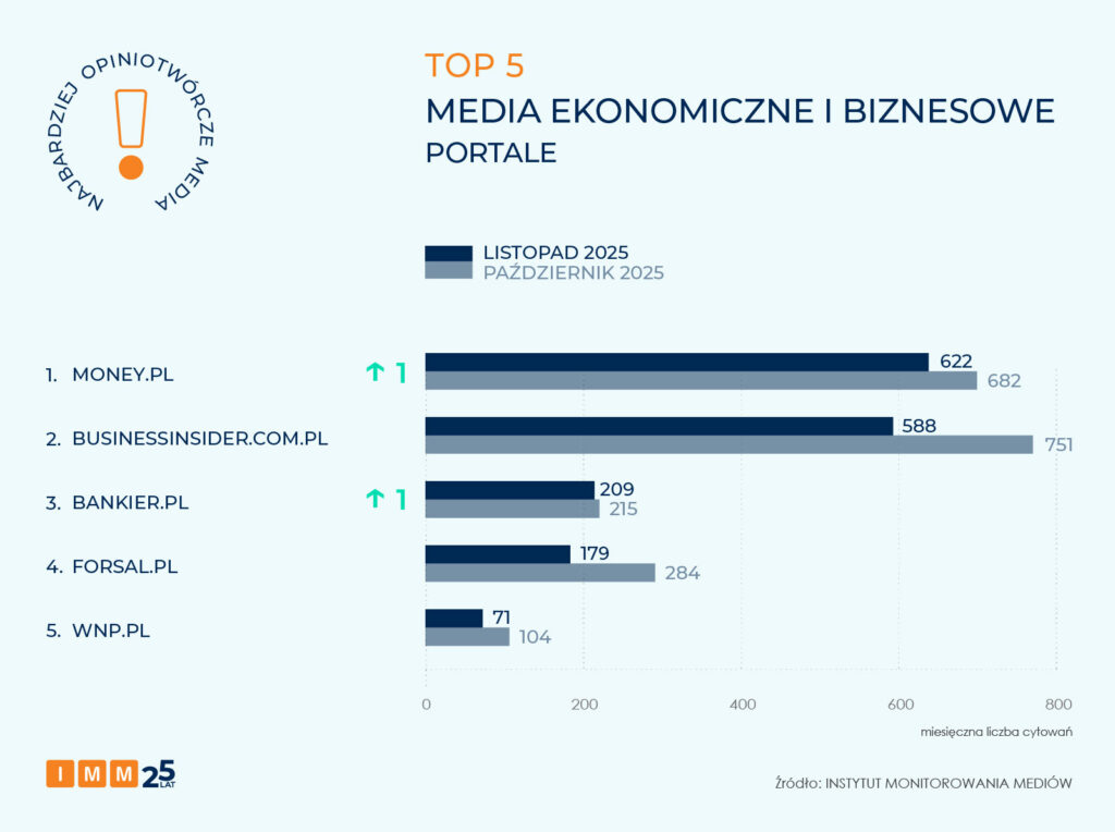 Zestawienie IMM najbardziej opiniotwórczych portali o tematyce ekonomiczno-biznesowej otwiera Money (awans o 1 pozycję), który wygenerował 622 cytowania. Portal poinformował o odejściu Roberta Kropiwnickiego z funkcji wiceministra aktywów państwowych.
