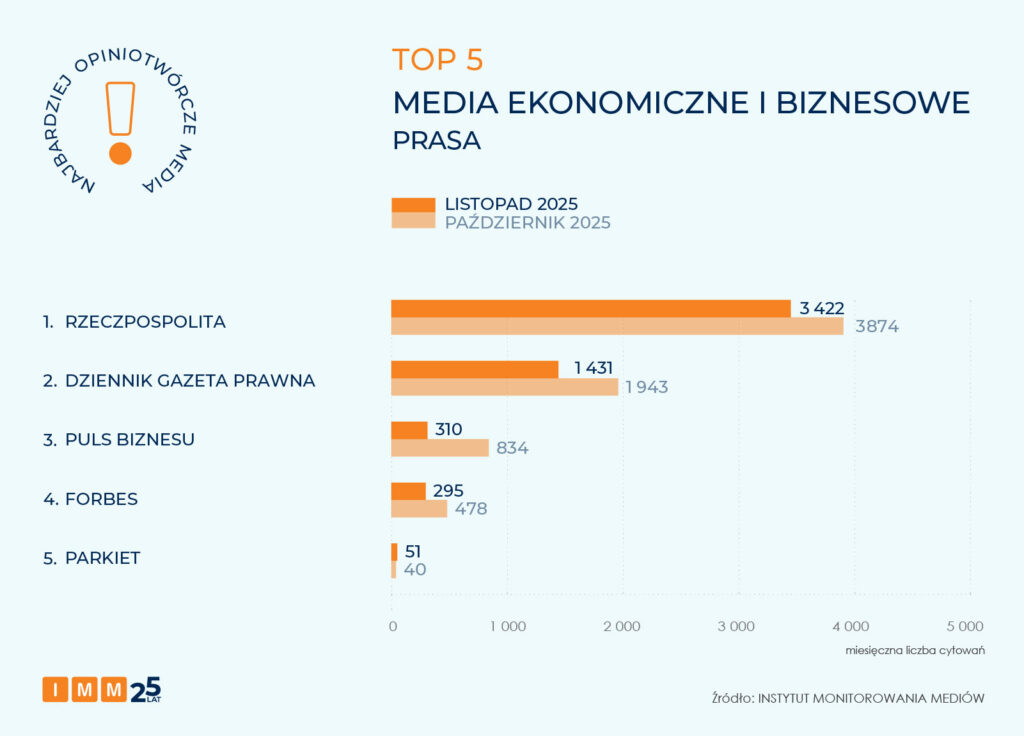 Ranking najbardziej opiniotwórczych tytułów prasowych o tematyce biznesowej otwiera „Rzeczpospolita”, osiągając wynik ponad 3,4 tys. cytowań.