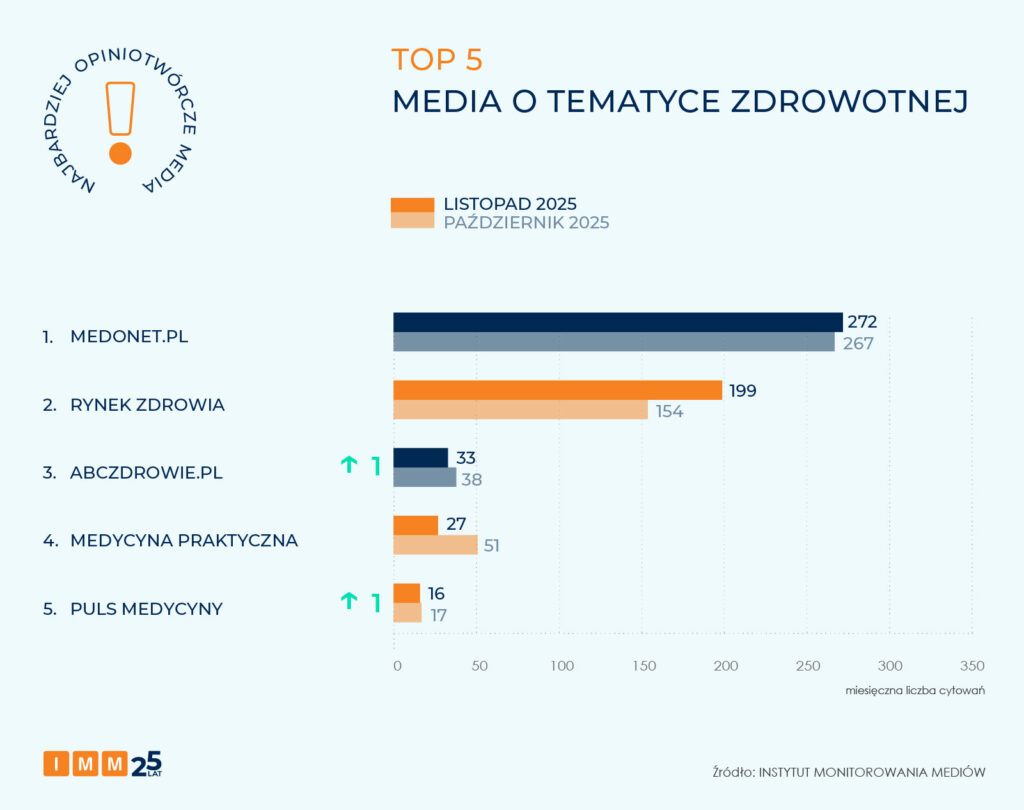 W rankingu najczęściej cytowanych mediów o tematyce medycznej pierwsze miejsce utrzymał Medonet, osiągając wynik 272 wzmianek. Portal przeprowadził rozmowę z ministrą zdrowia Jolantą Sobieranską-Grendą, która podsumowała sto dni pracy na stanowisku.