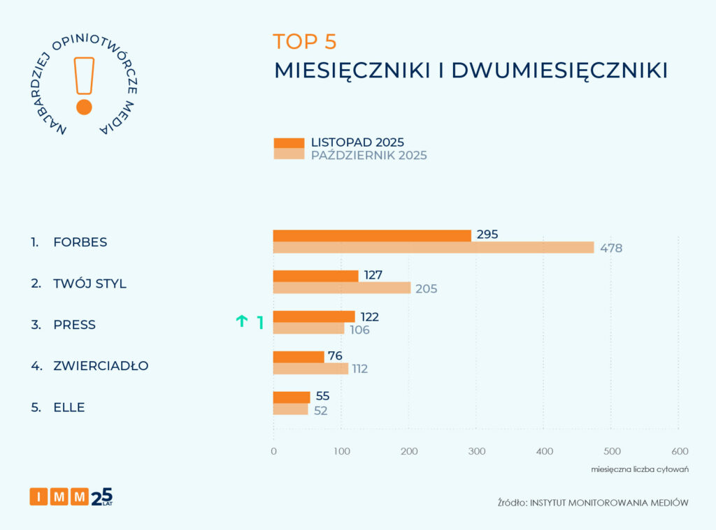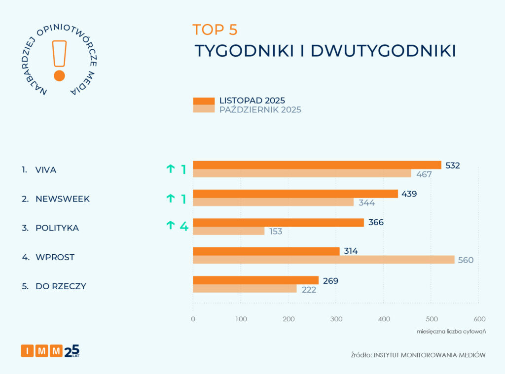 Podium najbardziej opiniotwórczych tygodników i dwutygodników otwiera „Viva” (awans o 1 pozycję), zdobywając w listopadzie 532 cytowania m.in. dzięki rozmowie z Pierwszą Damą Martą Nawrocką na temat jej życia w Pałacu Prezydenckim.