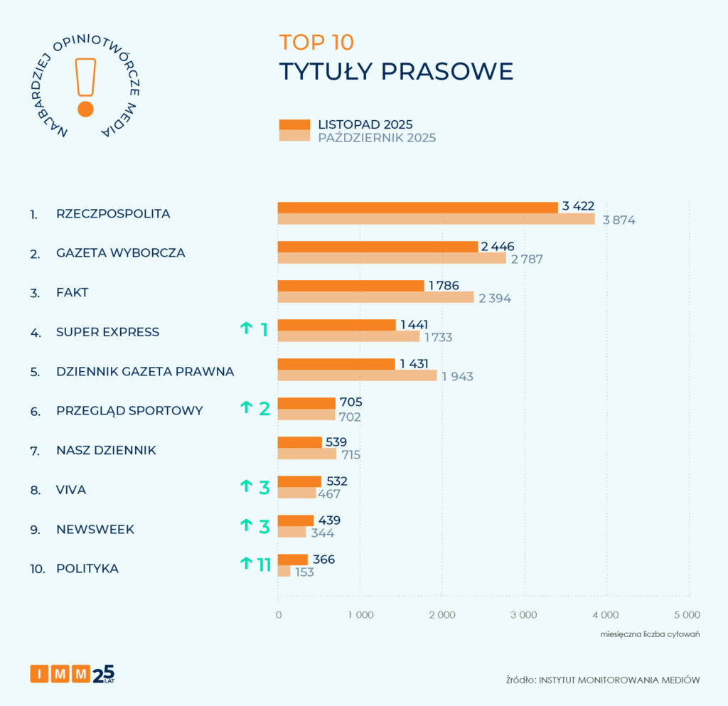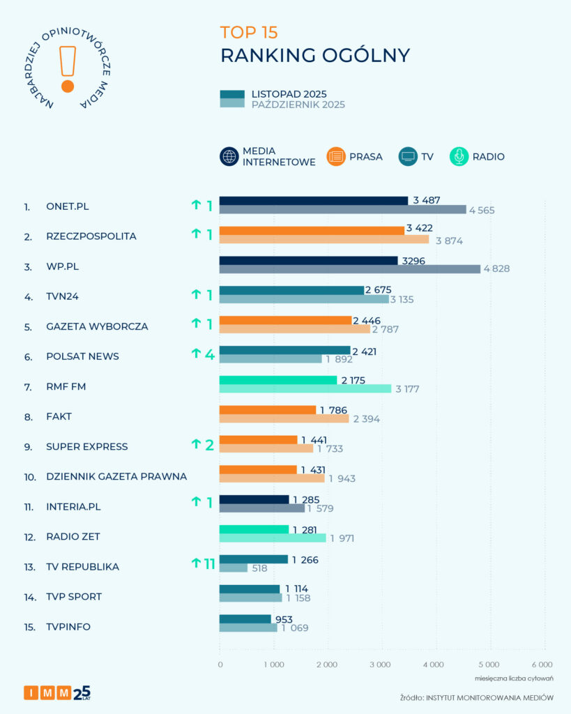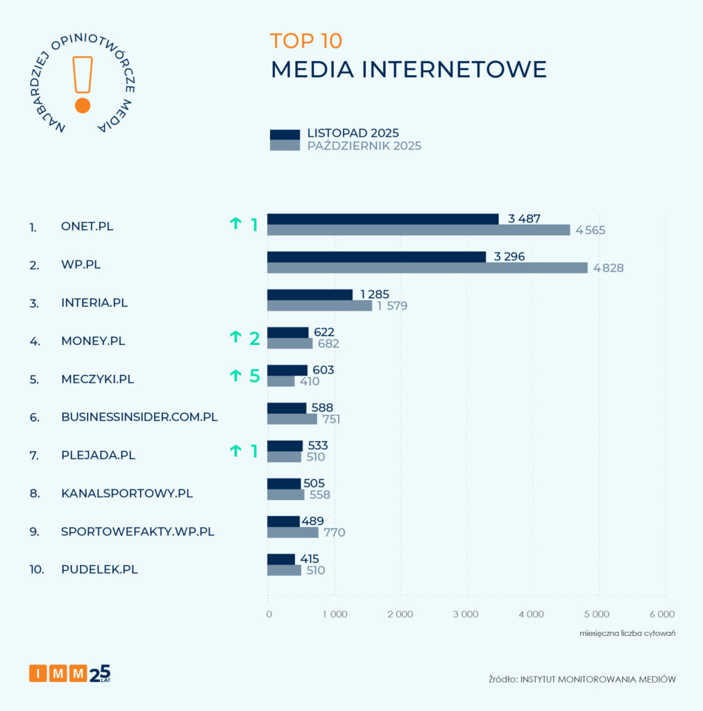 Najbardziej opiniotwórczym medium listopada, z awansem o jedną pozycję w porównaniu z poprzednim zestawieniem, został Onet z wynikiem niemal 3,5 tys. cytowań. Portal nagłośnił sprawę 46 sędziów, których awans zablokował prezydent Karol Nawrocki.