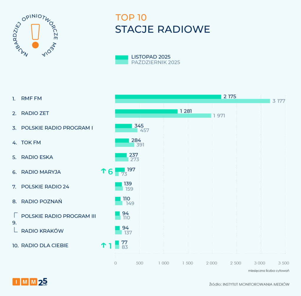 Pozycję lidera w rankingu najczęściej cytowanych stacji radiowych listopada utrzymało RMF FM, osiągając wynik niemal 2,2 tys. odniesień w mediach. Rozgłośnia jako pierwsza poinformowała, że prezydent Karol Nawrocki weźmie udział w Marszu Niepodległości.
