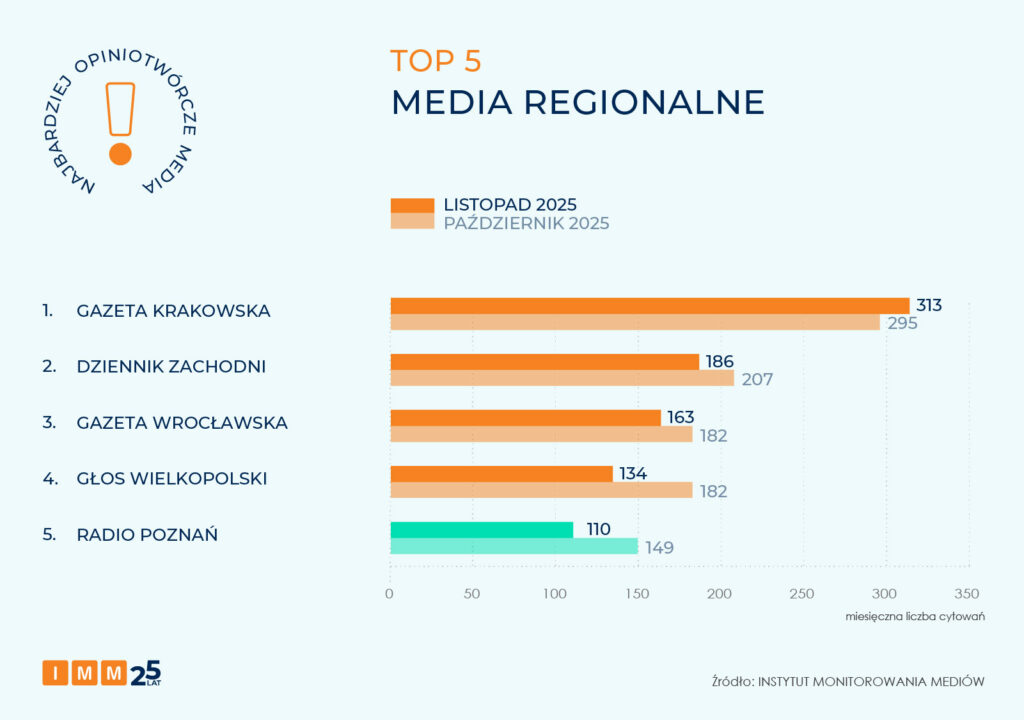 Zestawienie IMM najbardziej opiniotwórczych mediów regionalnych listopada otwiera „Gazeta Krakowska” (313 cytowań). Dziennik informował o fali zwolnień w sektorze prywatnym w firmach mających swoje siedziby w Krakowie.