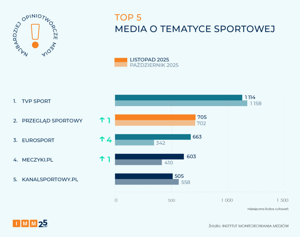 Najbardziej opiniotwórczym medium o tematyce sportowej w listopadzie został TVP Sport, który osiągnął wynik ponad 1,1 tys. odniesień w innych mediach. Cytowane były przede wszystkim wypowiedzi piłkarzy i selekcjonera reprezentacji Polski po wygranym meczu eliminacji mistrzostw świata z Maltą.