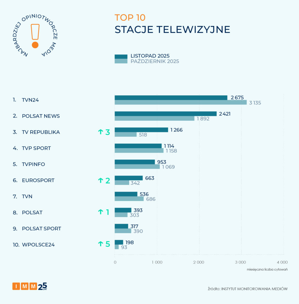 Awans o 5 pozycji zanotowała telewizja wPolsce24, która uzyskała 198 cytowań. Na antenie stacji Pierwsza Dama Marta Nawrocka zapowiedziała otwarcie fundacji, która ma zajmować się m.in. walką z przemocą w sieci i pomocą osobom niepełnosprawnym.