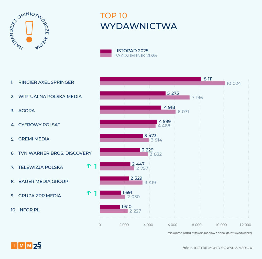Pierwsze miejsce wśród najbardziej opiniotwórczych wydawnictw listopada utrzymuje Ringier Axel Springer Polska, którego redakcjeBusiness Insider, „Fakt”, „Forbes”, Medonet, „Newsweek”, Noizz, Onet, Plejada i „Przegląd Sportowy” były cytowane przez dziennikarzy innych mediów w Polsce ponad 8,1 tys. razy.