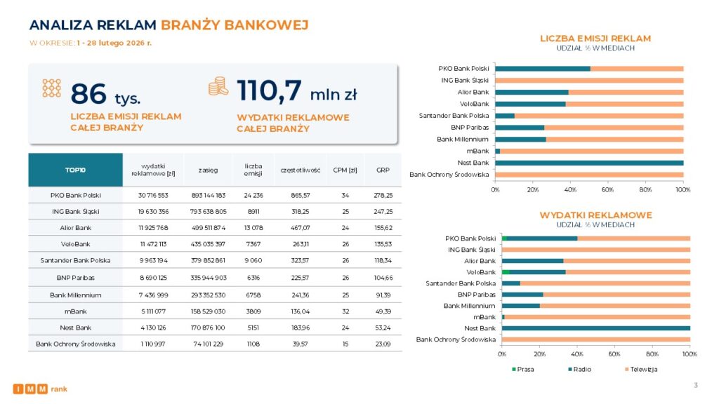 W pierwszej trójce banków, które osiągnęły najwyższą medialność w lutym 2026 roku są PKO Bank Polski, Bank Pekao S.A. oraz Santander Bank Polska – wynika z badania Instytutu Monitorowania Mediów (IMM). Kolejność ta jest analogiczna do rankingu największych banków w Polsce pod względem aktywów, przygotowanego przez serwis Bankier. PKO Bank Polski jest również liderem zestawienia pod względem wartości ekspozycji marki w mediach.