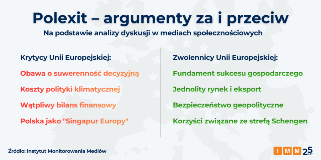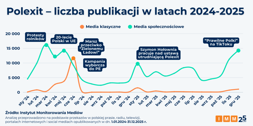 Instytut Monitorowania Mediów przeanalizował temat Polexitu, który powrócił do dyskusji w mediach społecznościowych do poziomu bliskiego początkowi 2024 r. Wtedy emocje internautów wywołały protesty rolników. W ostatnich tygodniach Polexit był szeroko komentowany po publikacji na TikToku video wygenerowanych przez sztuczną inteligencję, w których avatary „młodych Polek” wzywały do wyjścia z Unii Europejskiej. W raporcie analitycy IMM wskazują wydarzenia, które najczęściej wpływają na rozwój antyunijnych narracji.