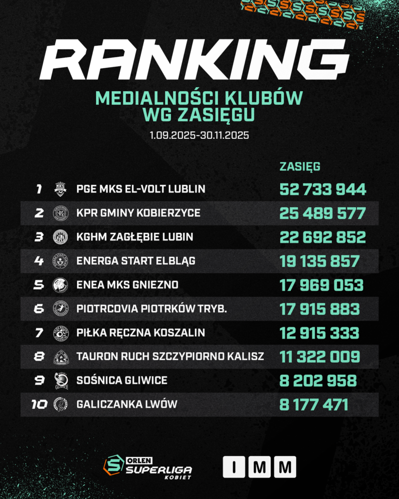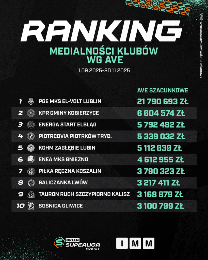 Liderem rankingu został PGE MKS El-Volt Lublin, którego materiały medialne osiągnęły zasięg ponad 52,7 miliona kontaktów, a wartość ekwiwalentu reklamowego (AVE) wyniosła imponujące 21,8 miliona złotych.