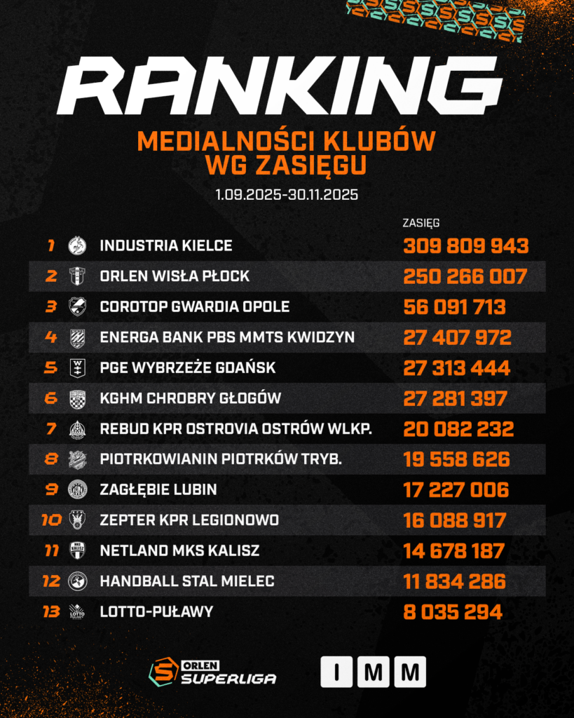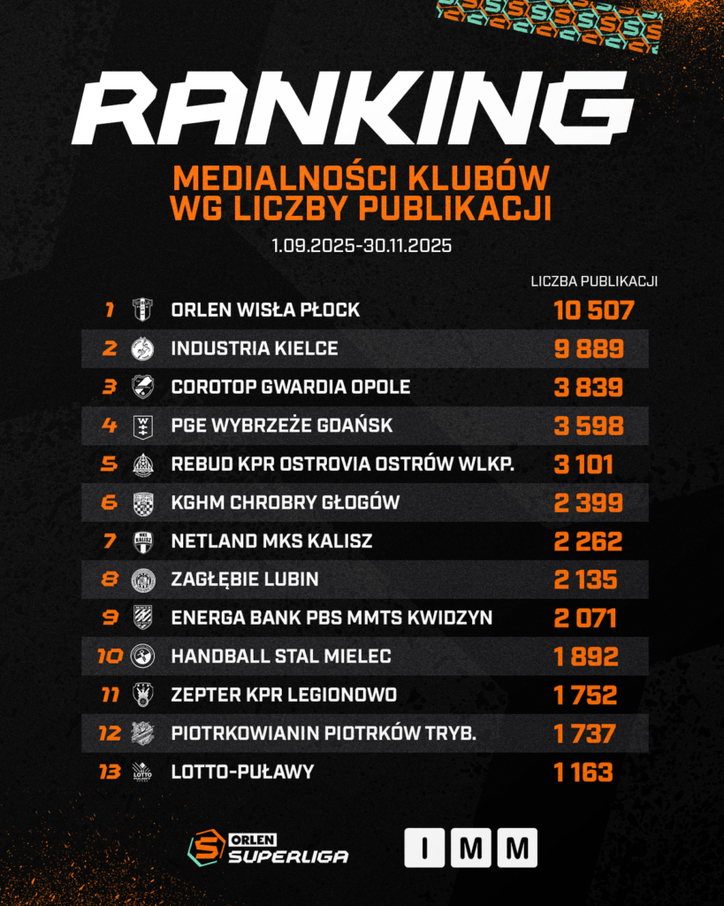 Instytut Monitorowania Mediów przygotował raport medialności klubów ORLEN Superligi i ORLEN Superligi Kobiet za okres od 1 września do 30 listopada 2025 roku. Podsumowanie obejmujące prasę, radio, telewizję, Internet oraz media społecznościowe pokazuje duże zainteresowanie rozgrywkami w przestrzeni medialnej.