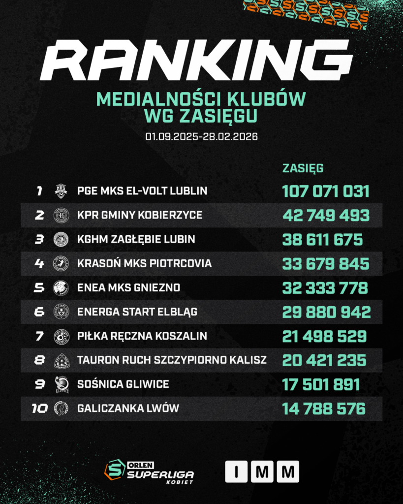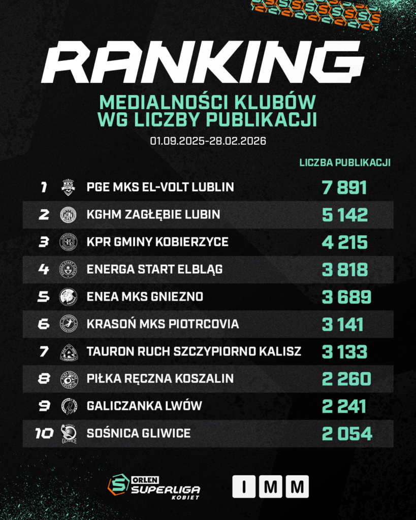 Instytut Monitorowania Mediów (IMM) przygotował raport medialności klubów ORLEN Superligi i ORLEN Superligi Kobiet za okres od 1 września 2025 roku do 28 lutego 2026 roku. Podsumowanie obejmujące prasę, radio, telewizję, Internet oraz media społecznościowe pokazuje duże zainteresowanie rozgrywkami w przestrzeni medialnej.