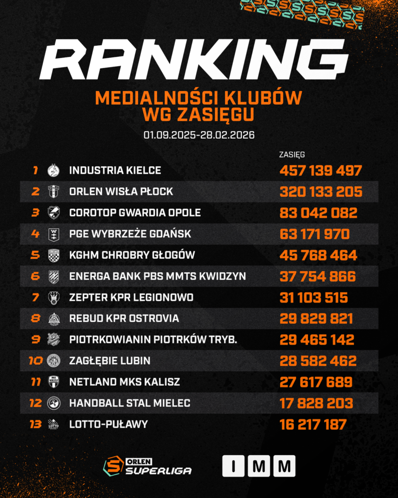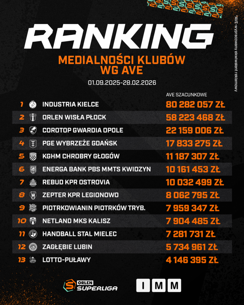 Liderem tego zestawienia w ORLEN Superlidze pozostaje również Industria Kielce, której łączny zasięg medialny wyniósł ponad 457 milionów kontaktów, a wartość AVE oszacowano na ponad 80 milionów złotych.