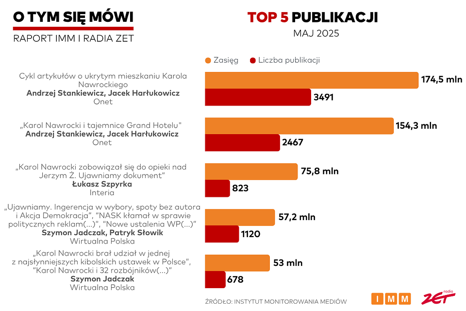 Cykl artykułów Onetu o drugim mieszkaniu Karola Nawrockiego zdominował w sposób bezprecedensowy majowe zestawienie najbardziej zasięgowych publikacji w Polsce. Comiesięczny raport „O tym się mówi” przygotowuje Instytut Monitorowania Mediów (IMM) we współpracy z Radiem ZET. Powstaje on w ramach projektu Nagroda Radia ZET im. Andrzeja Woyciechowskiego.