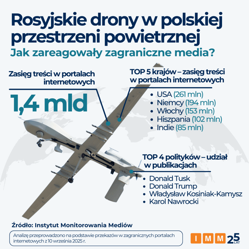 Instytut Monitorowania Mediów sprawdził zainteresowanie zagranicznych redakcji internetowych incydentem z rosyjskimi dronami naruszającymi polską przestrzeń powietrzną. W ciągu jednej doby w portalach na całym świecie ukazało się 33,5 tysiąca przekazów, które uzyskały zasięg szacowany na 1,4 mld kontaktów. Stany Zjednoczone, Niemcy i Włochy to kraje, w których ta informacja dotarła do największego grona internautów. Dziennikarze podkreślali, że jest to bardzo ważny test dla USA. Donald Trump był obecny w zagranicznych publikacjach częściej niż prezydent Karol Nawrocki i minister obrony Władysław Kosiniak-Kamysz.