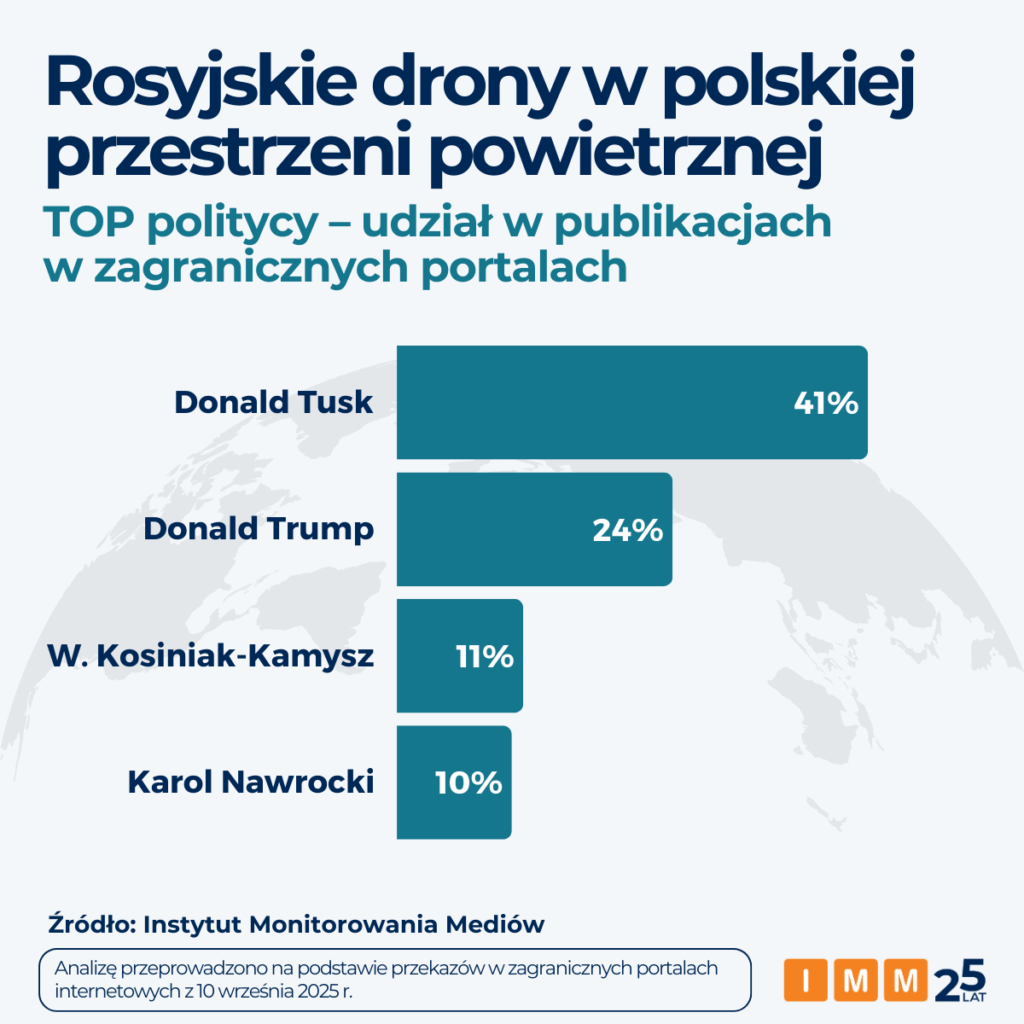 Analitycy IMM prześledzili również, jak na portalach zagranicznych przedstawiano polskich liderów politycznych. Premier Donald Tusk był opisywany jako lider reagujący zdecydowanie, zarządzający akcją obronną Polski oraz koordynujący działania z sojusznikami NATO. Portale komunikowały jego decyzje jako prawidłowe i adekwatne do skali zagrożenia. Był obecny w 41% artykułów. Prezydent Karol Nawrocki był wzmiankowany w przekazach internetowych 4-krotnie rzadziej od premiera. Zwykle w kontekście reprezentacyjnym, jako głowa państwa konsolidująca wobec społeczności międzynarodowej.