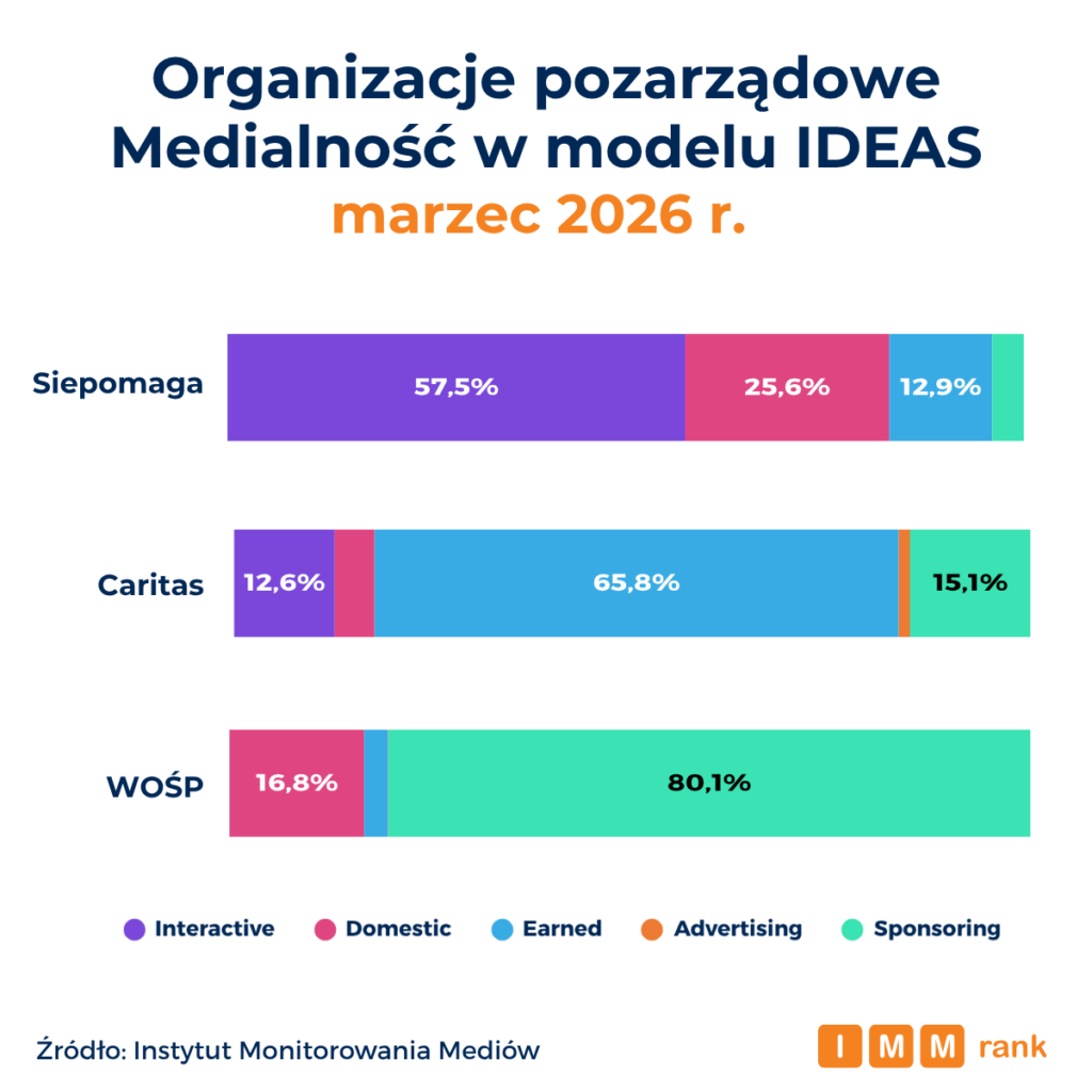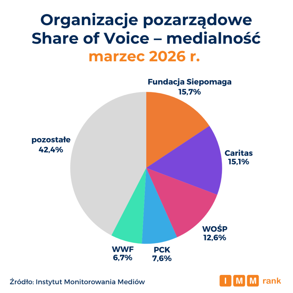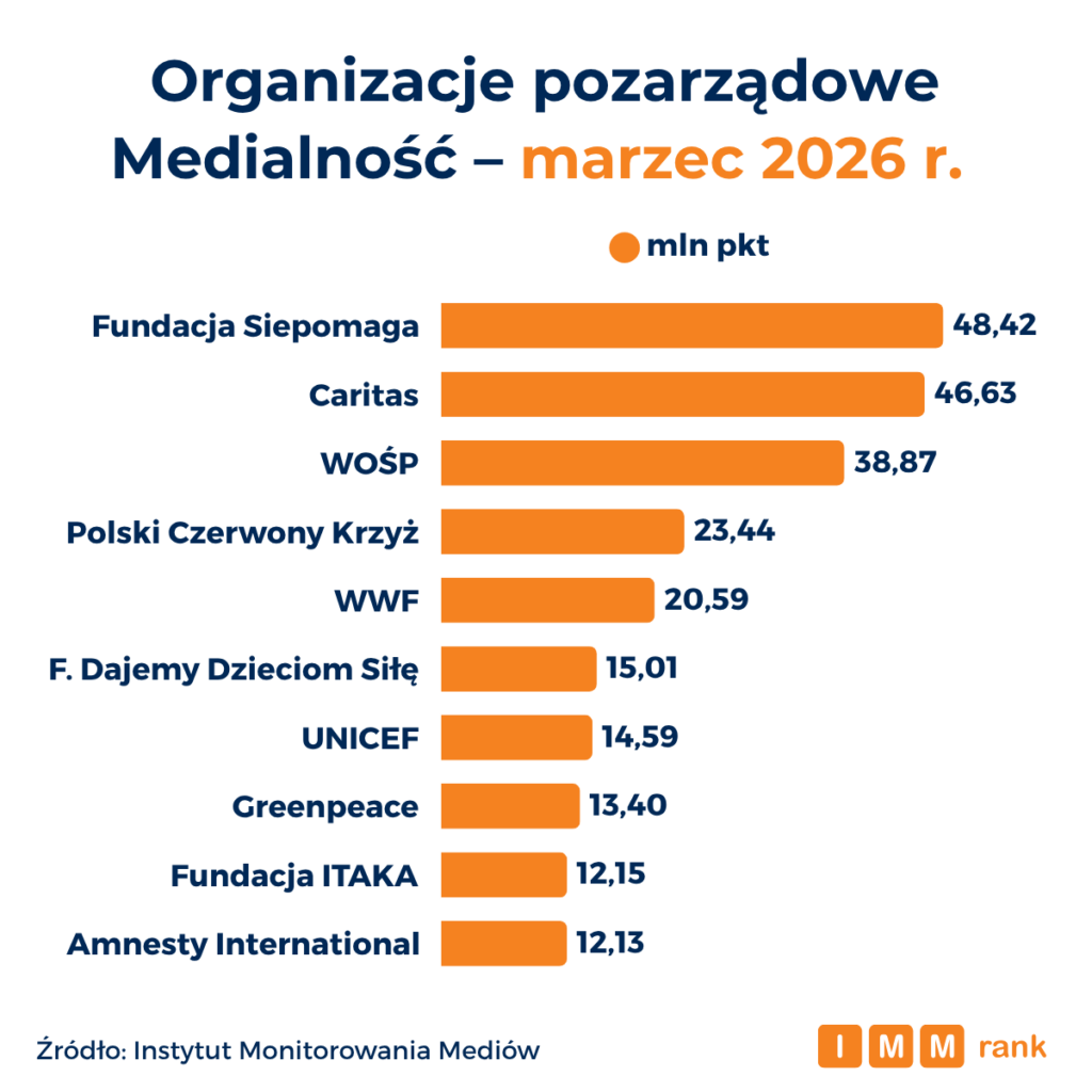 Fundacja Siepomaga, Caritas oraz Wielka Orkiestra Świątecznej Pomocy są na czele rankingu najbardziej medialnych organizacji pozarządowych marca 2026 r. – wynika z danych Instytutu Monitorowania Mediów (IMM). Zestawienie pokazuje bardzo zbliżony poziom obecności medialnej dwójki liderów oraz ujawnia zróżnicowane strategie promocyjne najpopularniejszych organizacji – od stawiania na silną obecność w social mediach, poprzez budowanie skutecznych relacji z mediami, aż po szerokie wykorzystanie partnerstw i działań sponsoringowych.