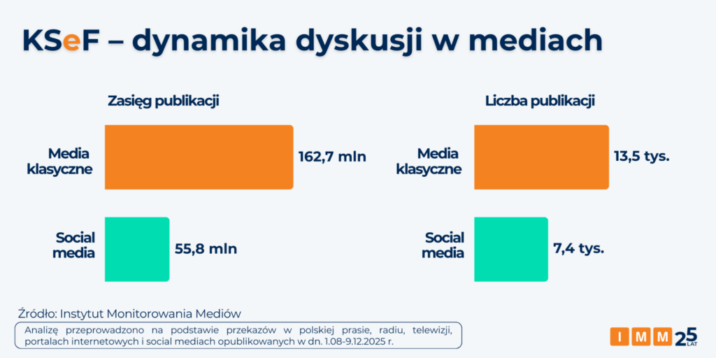 Temat KSeF jest stale obecny w social mediach i budzi w nich silne emocje, jednak to media klasyczne odpowiadają za blisko 75% zasięgu treści dotyczących rządowej inicjatywy. W analizowanym okresie w prasie, radiu, telewizji i portalach informacyjnych ukazało się 13,5 tys. publikacji o zasięgu szacowanym na 162,7 mln potencjalnych kontaktów z przekazem.