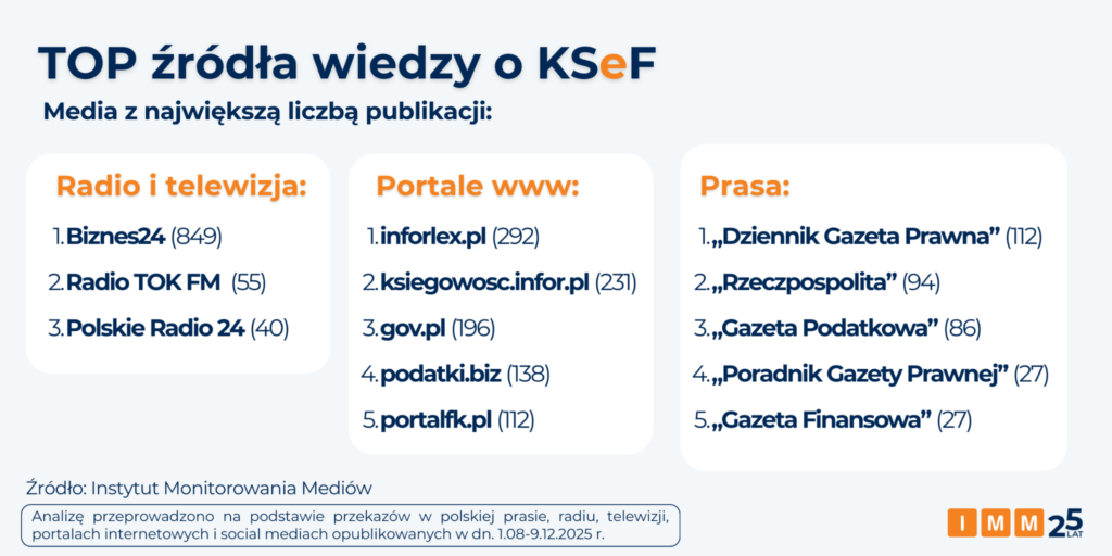Eksperci IMM sprawdzili także, które media najczęściej podejmują ten temat. Z analizy wynika, że najwięcej materiałów ukazuje się w mediach o tematyce biznesowej i prawnej. Wśród stacji radiowych i telewizyjnych dominuje Biznes24 (849 publikacji), wyprzedzając Radio TOK FM i PR24. W internecie najwięcej informacji dostarczają serwisy inforlex.pl oraz ksiegowosc.infor.pl, a także oficjalny portal gov.pl. W kategorii prasy drukowanej liderem pozostaje „Dziennik Gazeta Prawna” przed „Rzeczpospolitą” i „Gazetą Podatkową”.