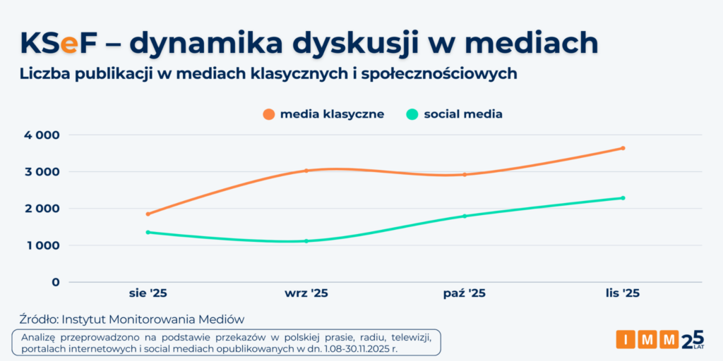 Wdrożenie krajowego systemu fakturowania budzi coraz większe zainteresowanie zarówno w mediach klasycznych jak i społecznościowych. Analitycy IMM zauważyli, że w analizowanym okresie liczba publikacji na ten temat niemal się podwoiła – od 3,2 tys. przekazów w sierpniu br. do 5,9 tys. w listopadzie 2025 roku.