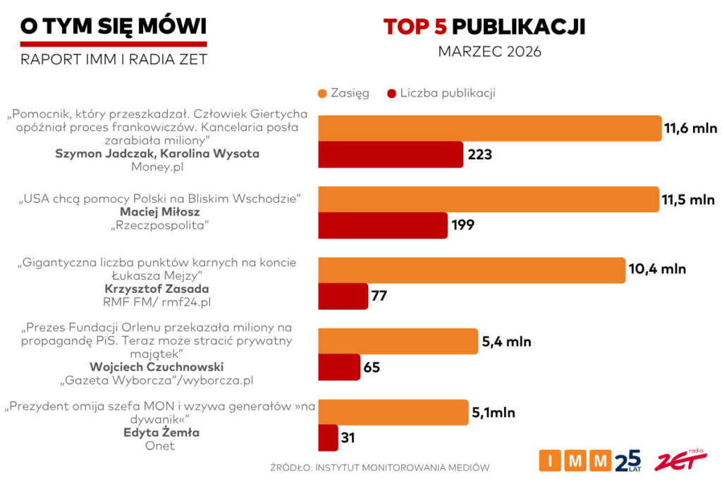 „Pomocnik, który przeszkadzał. Człowiek Giertycha opóźniał proces frankowiczów. Kancelaria posła zarabiała miliony” to tytuł najbardziej zasięgowej publikacji medialnej marca 2026 roku. Według ustaleń Szymona Jadczaka i Karoliny Wysoty kancelaria Romana Giertycha zarobiła 8,7 mln zł za reprezentowanie Getin Noble Banku. W tym czasie bliski współpracownik obecnego posła miał przez lata sabotować proces grupy frankowiczów walczących o unieważnienie niekorzystnych umów z Getin Noble Bankiem. Dzięki takim nieetycznym praktykom Leszek Czarnecki mógł zaoszczędzić setki milionów złotych. Na te ustalenia inne media powoływały się w marcu 223 razy, a informacja uzyskała zasięg 11,6 mln potencjalnych kontaktów z przekazem.