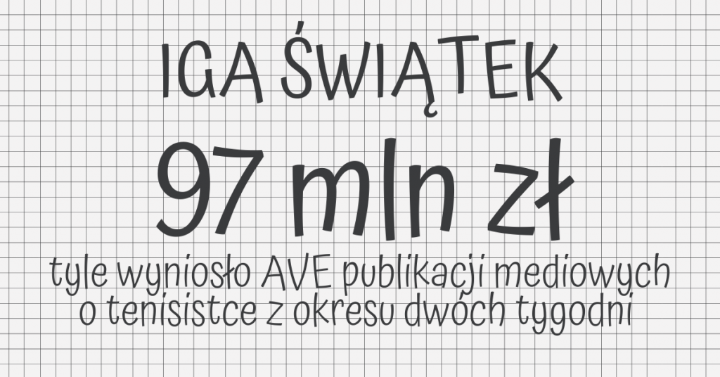 W dwa tygodnie, od 4 października, kiedy Iga Świątek zakwalifikowała się do ćwierćfinałów French Open 2020, a następnie zwyciężyła w finale, we wszystkich mediach na jej temat pojawiło się ponad 70 tys. publikacji. Dotarcie zmonitorowanych materiałów to prawie 429 mln potencjalnych kontaktów o wartości ekwiwalentu reklamowego (AVE) prawie 97 mln zł. W samych stacjach radiowych i telewizyjnych na temat sukcesu tenisistki wyemitowano w tym okresie aż 712 wiadomości – podaje Instytut Monitorowania Mediów IMM.