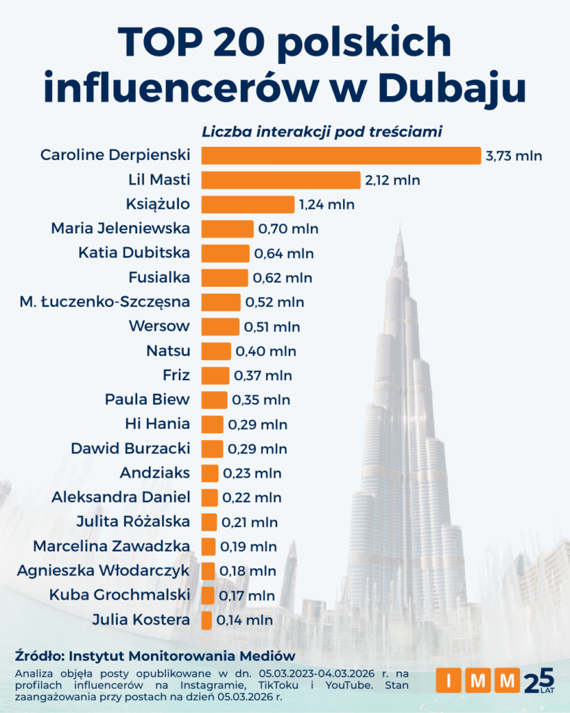 Badanie Instytutu Monitorowania Mediów objęło okres od 5 marca 2023 r. do 4 marca 2026 roku i dotyczyło twórców, których relacje z Dubaju najsilniej aktywizowały polską społeczność internetową. Liderką zestawienia jest Caroline Derpienski, która pod swoimi dubajskimi postami zgromadziła aż 3,7 mln interakcji (reakcji, komentarzy, udostępnień), budując wokół siebie aurę bogactwa oraz kontrowersji. Drugie miejsce zajmuje Lil Masti z wynikiem 2,1 mln reakcji, skupiając uwagę na rodzinnym i bezpiecznym aspekcie życia w emiracie. Na podium znalazł się także sceptycznie nastawiony do dubajskich luksusów Książulo, którego zasięgi przełożyły się na 1,2 mln interakcji pod treściami.