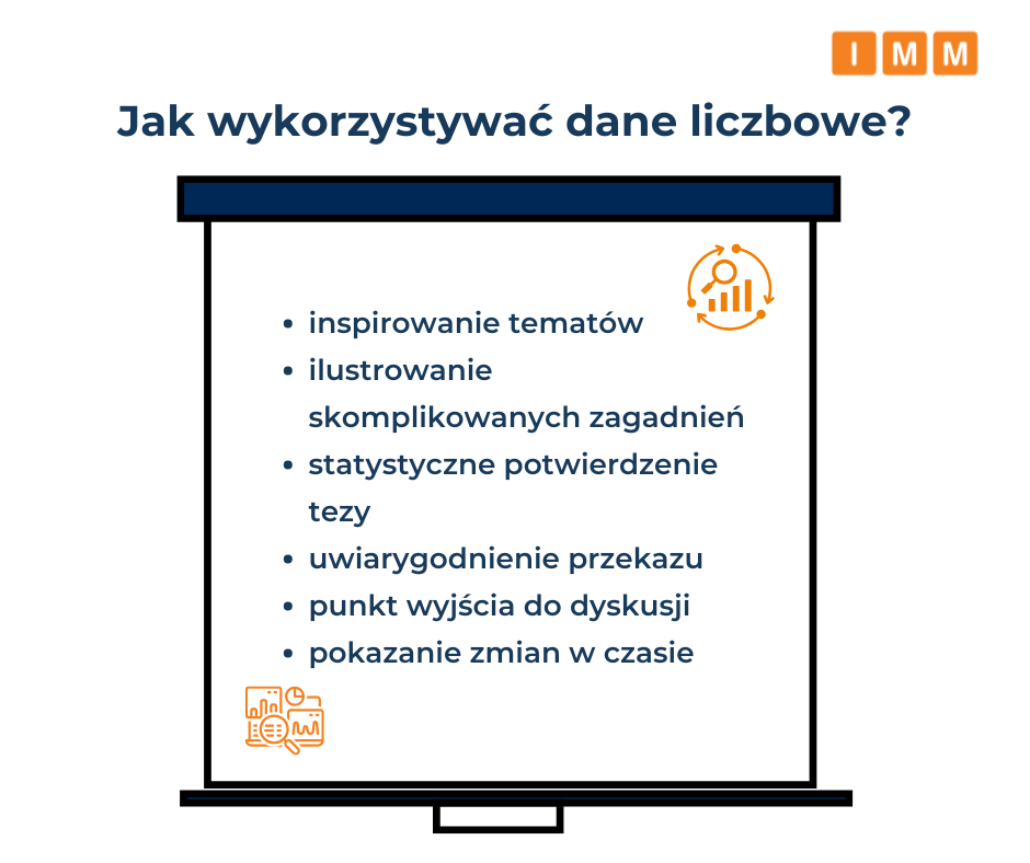 Dane są wdzięcznym przedmiotem do inspirowania tematów, a także do ilustrowania skomplikowanych zagadnień, ugruntowania ważnych tez statystycznie. Rzetelny insight oparty na danych uwiarygodnia nasz przekaz. Ciekawe poznawczo jest pokazanie zmian w czasie, lub w przestrzeni, wszelkie porównania stanowią interesujące tło, bazę do „dalszego ciągu” opowiadanej historii. Mogą być punktem wyjścia do analizy, gdy wyeksponujemy te najbardziej wyróżniające się, widoczne prawidłowości w celu potwierdzenia tezy.