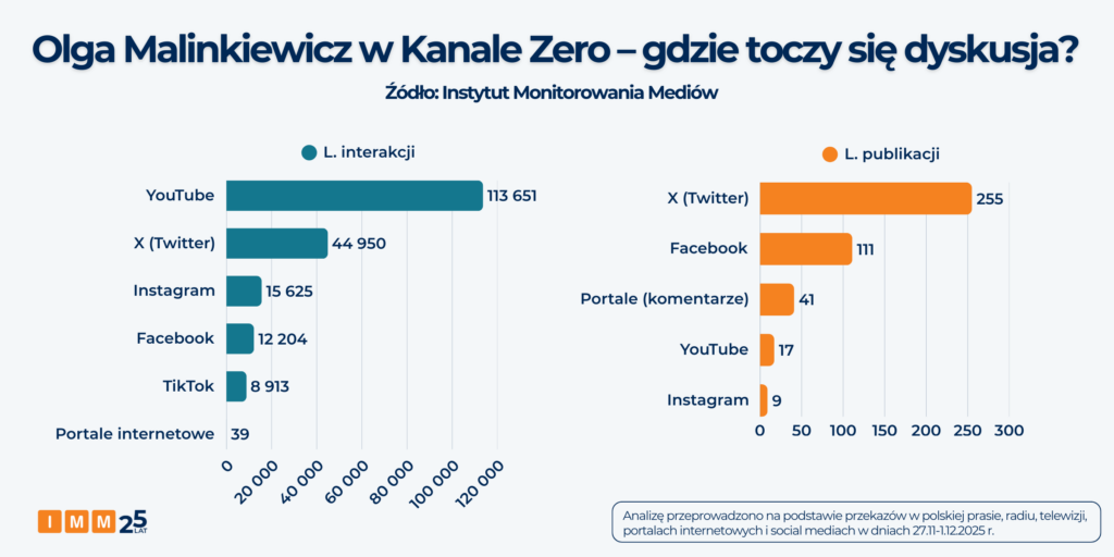 Największe zaangażowanie odbiorców koncentruje się na YouTub’ie, gdzie eksperci IMM odnotowali ponad 113,6 tys. interakcji. Drugim najaktywniejszym kanałem jest X (d. Twitter) z prawie 45 tys. interakcji. Także na X w ciągu 5 dni odnotowano najwięcej (255) postów wzmiankujących sprawę Olgi Malinkiewicz.